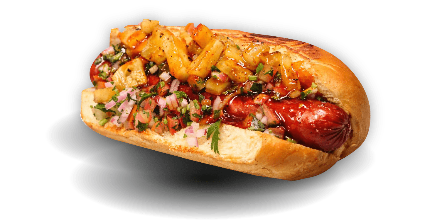 Salchicha de res, piña asada, ensalada the ribsy salsa mango habanero.